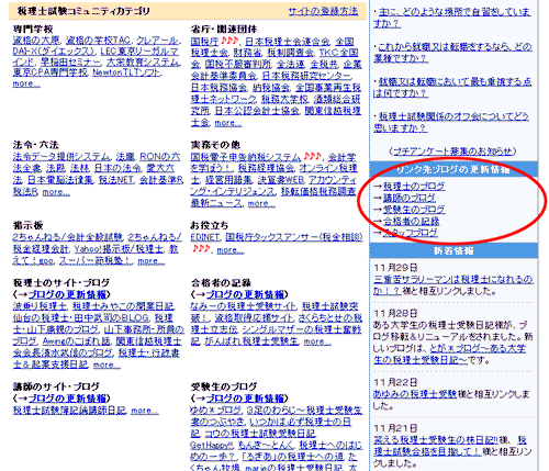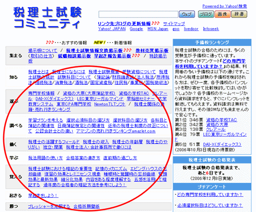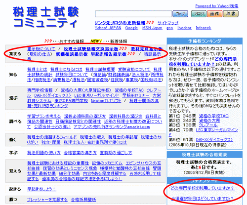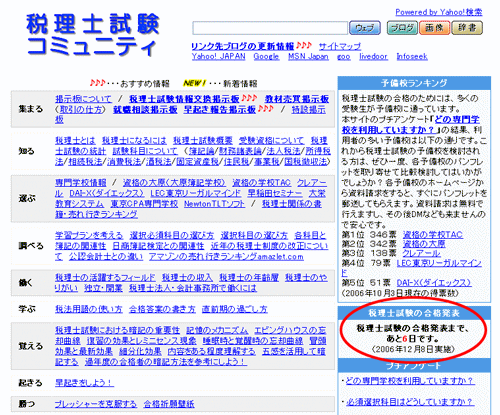 1.「税理士試験コミュニティ」の目的「税理士試験コミュニティ」は、 2.「税理士試験コミュニティ」の目標「税理士試験コミュニティ」の目標は、 具体的には、 目標に向けて、まだまだ至らない点もあるかと思いますが、ぜひアドバイスをいただき、受験生の皆様とともに、快適で有用なサイトを作り上げていきたいと思っております。 3.「税理士試験コミュニティ」の特徴「税理士試験コミュニティ」は、以下の5つの特徴を持っています。 (1)「税理士試験コミュニティ」は、受験生同士のコミュニティを最も重視しています。 「税理士試験コミュニティ」では、掲示板を積極的に設置し、かつ、プチアンケートも実施しております。 掲示板・プチアンケートともに、ユーザー様の要望があれば、随時、追加設置する予定です。 ![]() (2)「税理士試験コミュニティ」は、税理士試験の情報を網羅すべく努力しています。 「税理士試験コミュニティ」では、税理士試験に関するコンテンツの充実を図っております。 税理士試験のことならすべてが分かるサイトを目指し、今後も随時コンテンツを追加していきます。 ![]() (3)「税理士試験コミュニティ」は、試験日まであと何日か、すぐに分かります。 「税理士試験コミュニティ」では、JavaScriptを利用し、毎日0時になったら、数字が減る仕組みを作り、税理士試験の本試験までのカウントダウンをしております。 これにより、税理士試験までの残りの日数が一目で分かり、受験生の勉強計画の一つの参考になることを目標としております。 ![]() (4)「税理士試験コミュニティ」は、リンク先のブログの更新情報が一目で分かります。 「税理士試験コミュニティ」では、RSSを利用して、リンク先のブログの更新情報がリアルタイムで、把握できます。 これにより、当サイトにいながら、多くのブログの更新の有無を知ることができ、例えば、「いつも見ているブログをクリックしてみたけれど更新されていなかった」というようなことも起きず、時間の節約になり、効率的により多くのブログを見ることができます。 なお、それぞれの分類ごとに、更新された日付・時間、及び、ブログタイトル・記事タイトルとともに、表示されるように設定してあります。 ![]() (5)「税理士試験コミュニティ」は、税理士試験に関係するサイトをカテゴリ別にリンクしています。 「税理士試験コミュニティ」では、税理士試験に有用なサイト・ブログを、カテゴリ別に整理してリンクしております。いずれも厳選してリンクをしており、税理士試験の受験生にとって必要なサイト・ブログをすべて網羅し、受験生の皆様に検索の負担が少なくなるように、努力しております。今後も、有用なサイト・ブログがありましたら、随時、追加していきます。 なお、「税理士試験コミュニティカテゴリ」にリンクしてあるサイト・ブログは、当サイトのコンテンツ外であるため、その内容については、当サイト管理人は関与しておりませんので、ご了承ください。 ![]() |